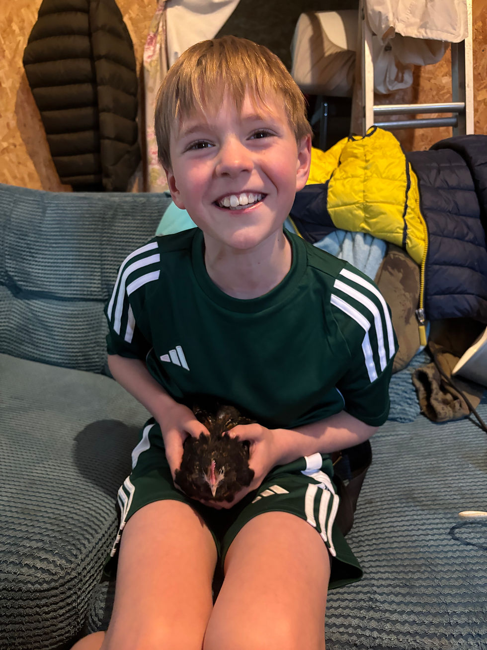Within minutes, Albs had completely fallen for a 6-week-old rooster. There was no hesitation, no debate—this was his chicken. And just like that, “Burnt Omelette” became part of the family.